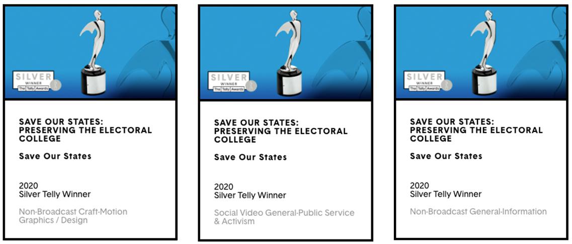 "It's an honor to have won not one, but three Telly Awards," Save Our States' Executive Director Trent England said. "We're not in this work for the awards but are grateful a video supporting the Electoral College has received such positive recognition from leading experts in the video and film industry. Special thanks to the team at Iron Light for making our vision for this video a reality."