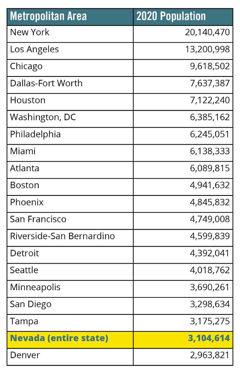 Lobbyists for the National Popular Vote interstate compact (NPV) often claim their election scheme would benefit the whole country. With the Nevada legislature taking steps to join the compact, it's important to compare Nevada's population to that of the top metro areas.
